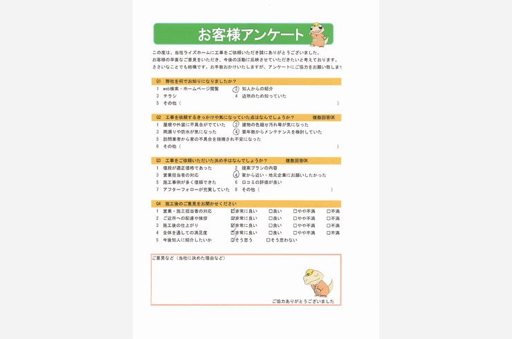 貸家居住者から、「屋根が傷んでいる」と何処かの業者に言われたとの事で、外壁塗装業者をネットで検索したところ、ライズホームに行きついた。「地元密着で信用第一」の姿勢と営業対応の良さ(早さ、丁寧)と「作業も職人気質」との説明に納得し契約した。コストもリーズナブルで、出来栄えも、カラー選択等のアドバイスも的確だったこともありで満足している。