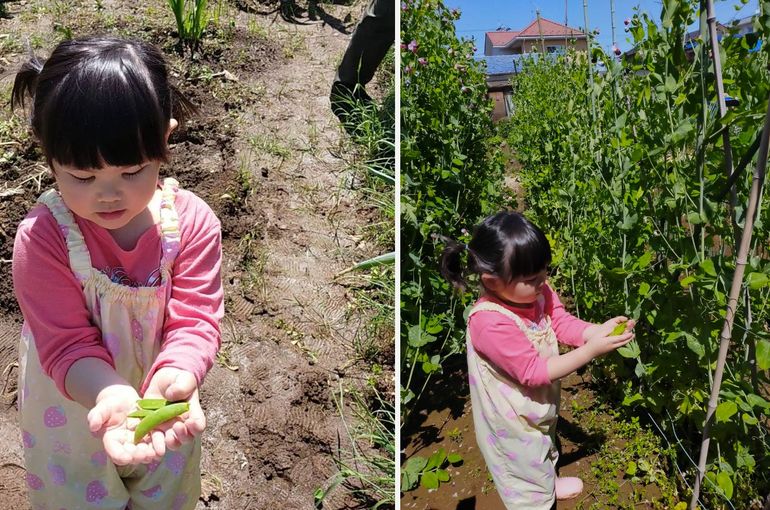 超がつくほど人見知りの娘ですが、前回の初対面でもあまりモジモジせず、今回はすぐに隣にいって収穫のお手伝いをはじめました。