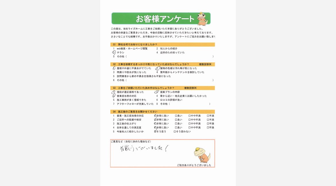 定期的にご自宅のメンテナンスを行っており、以前に雨漏りをしていて屋根カバー工事済みのため、今回は塗装メインで施工いたしました。チラシを見てお問い合わせいただき、更に良い評価をいただきありがとうございました!
