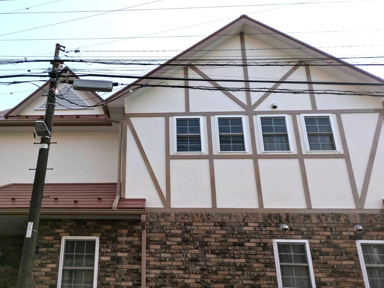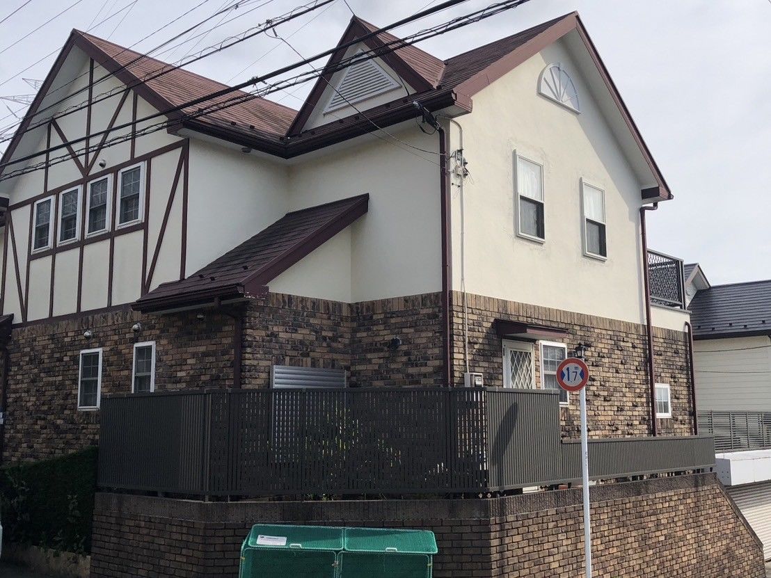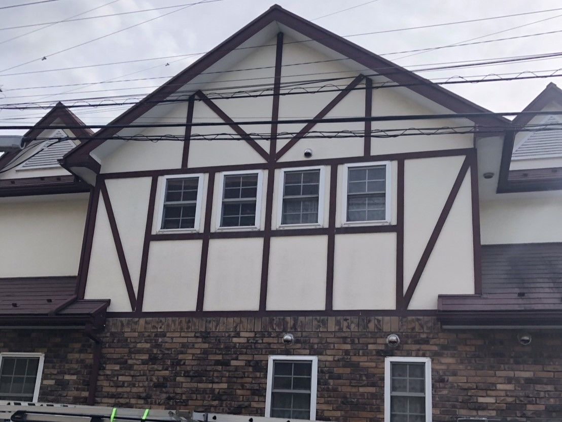 付帯部の色を深みのあるバーガンディーから明るいベージュに変更し、既存のレンガ部分にマッチした明るい印象の仕上がりとなりました🏠✨