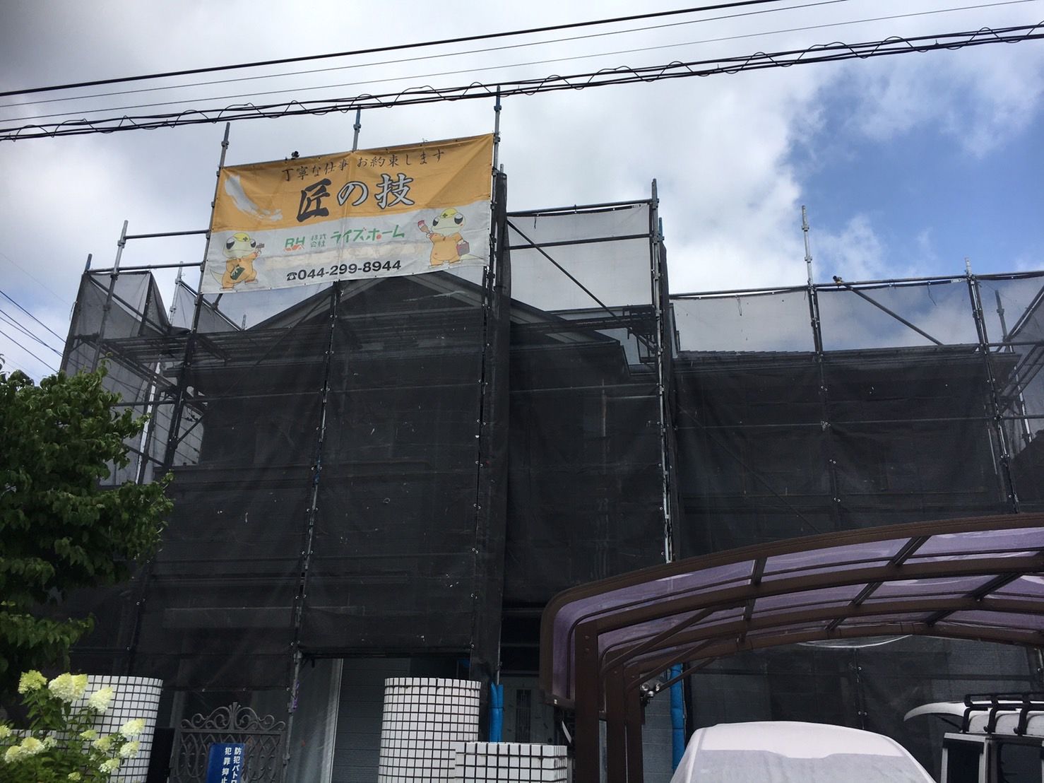 近隣の方々に工事のご挨拶を済ませ、足場架設を行います