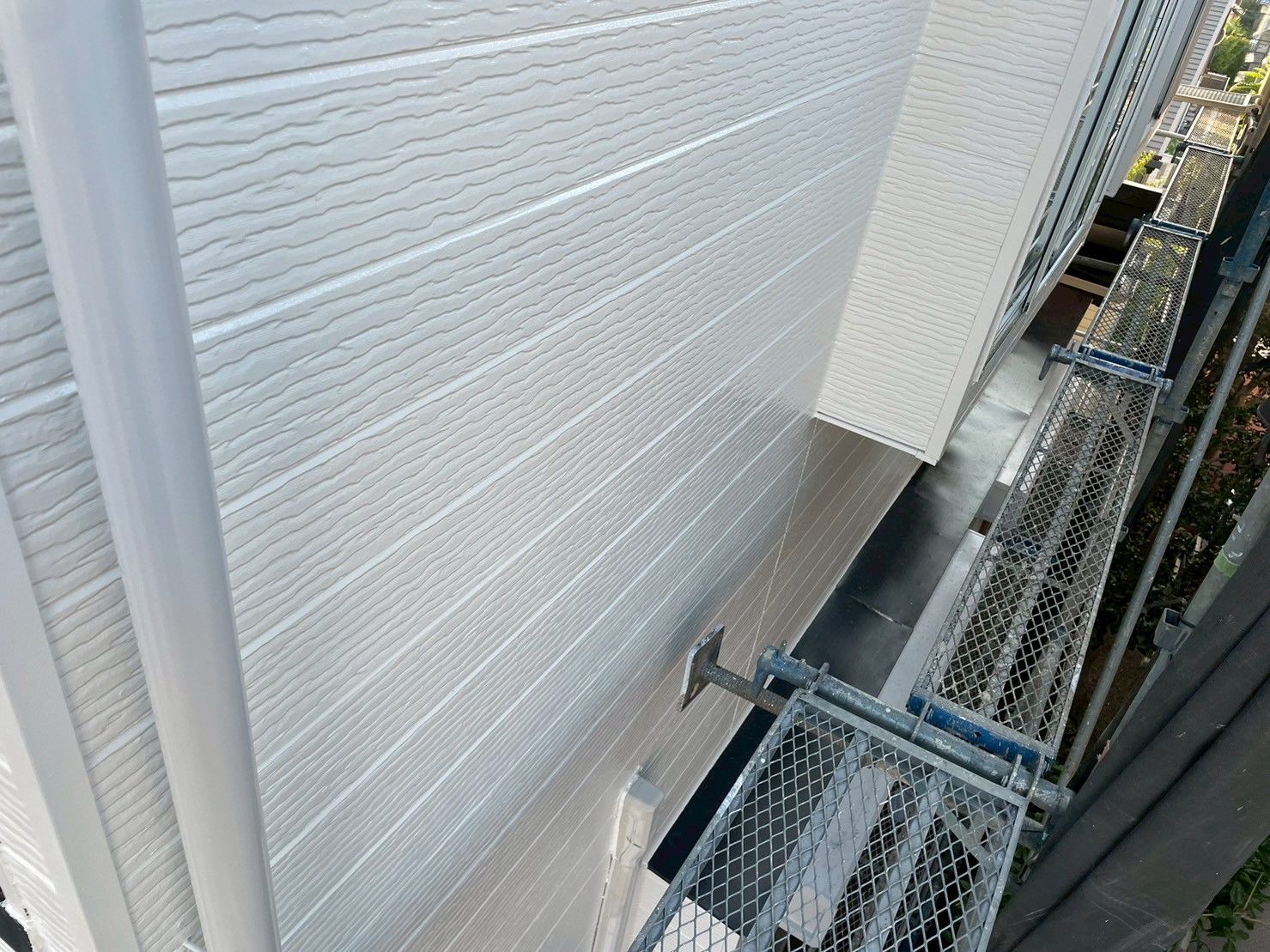 15年前の塗装時の施工不良に起因する塗膜剥がれが、下屋根上の外壁に集中して発生しておりました。劣化した外壁を適切な下地でしっかりと補修し、仕上げに塗装が長持ちするようトップコートを塗布しております。リフォームでよみがえった美観をより長く保ちながらお住まい頂けると思います🏠✨