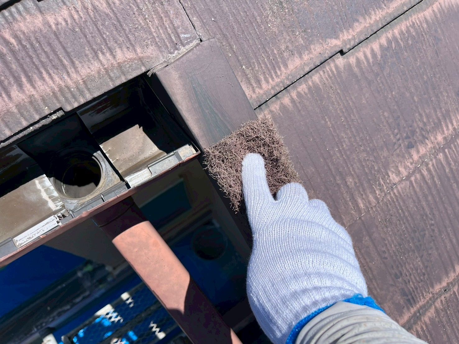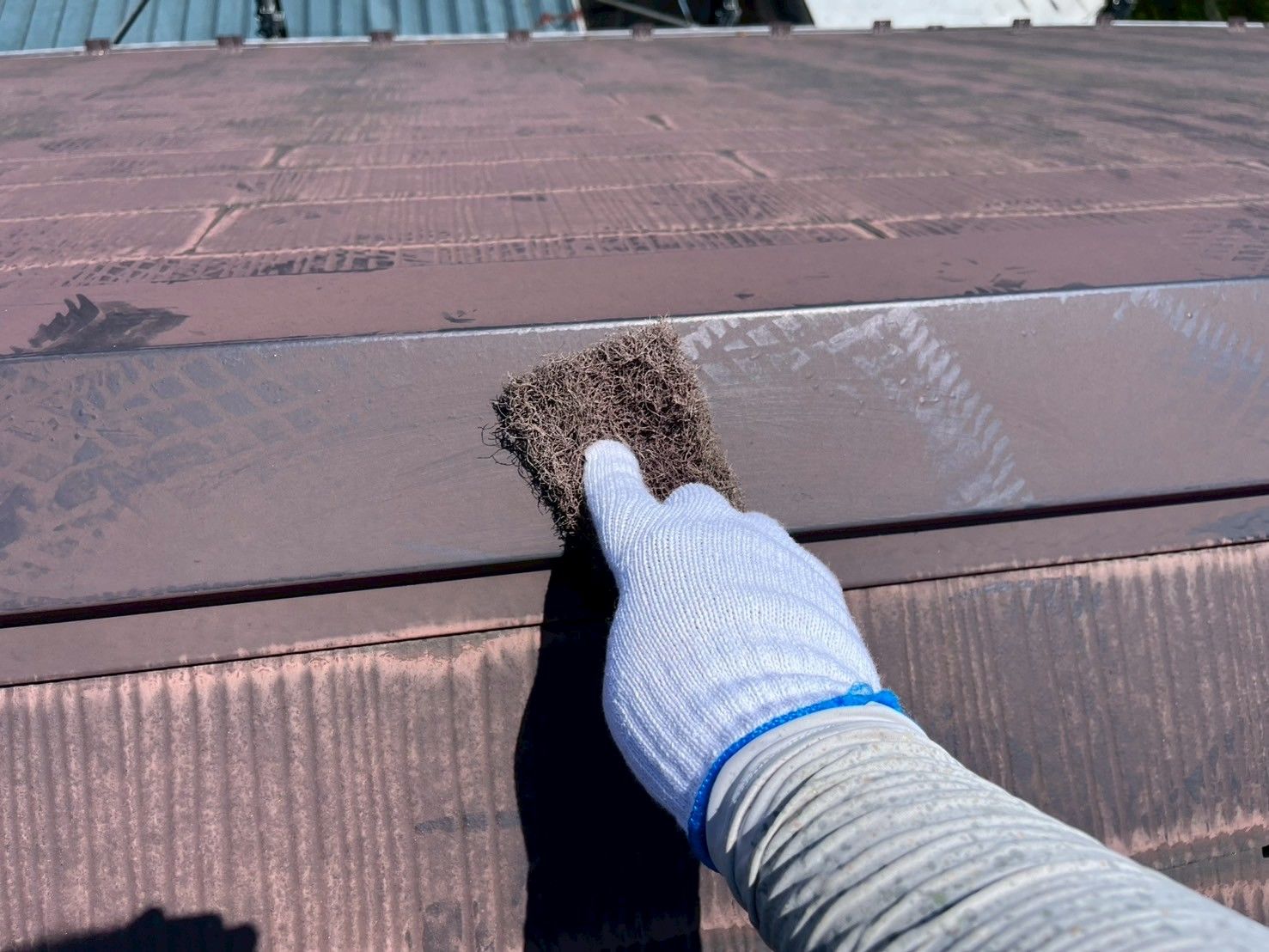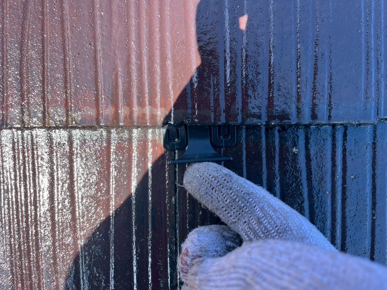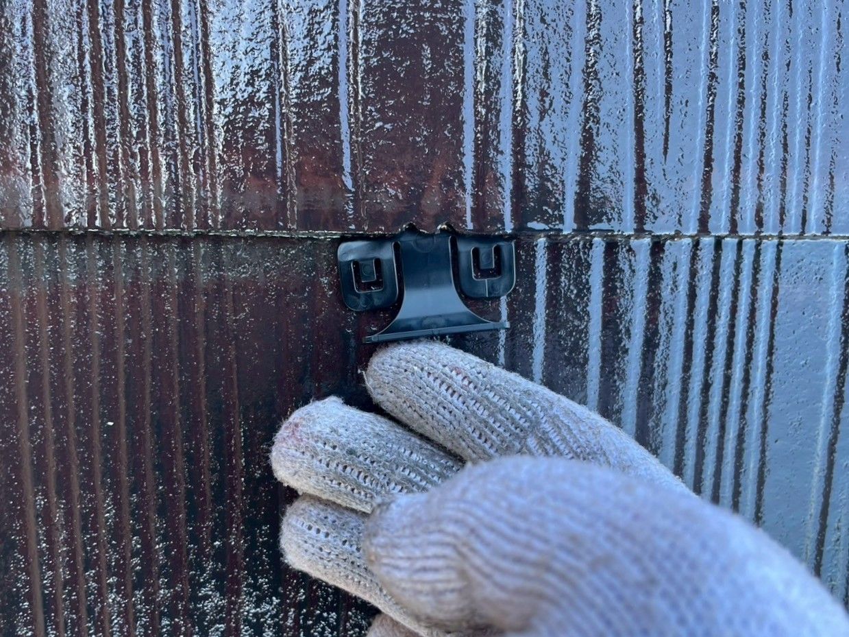 塗膜で屋根材同士が密着しないようタスペーサーを差し込んで隙間を確保します