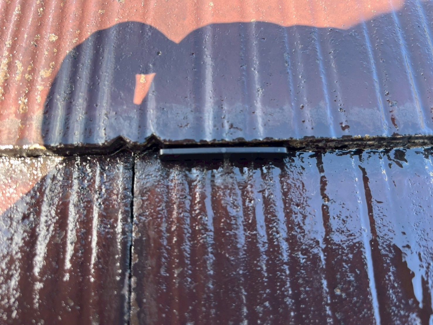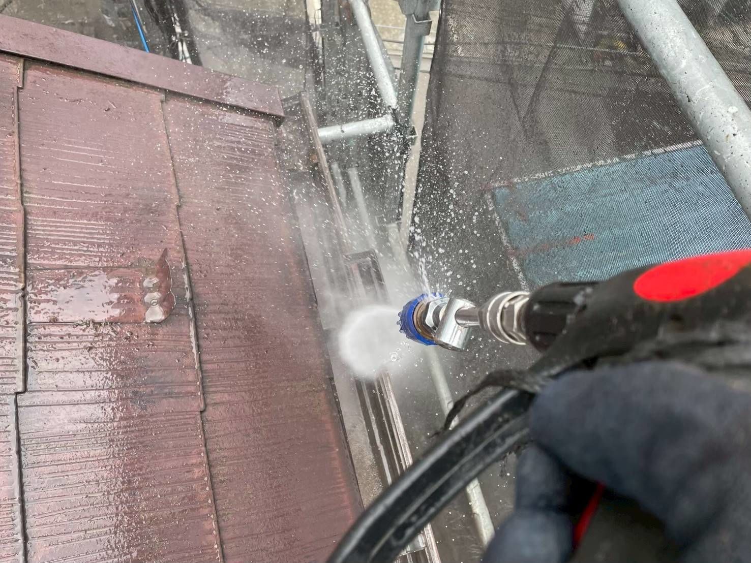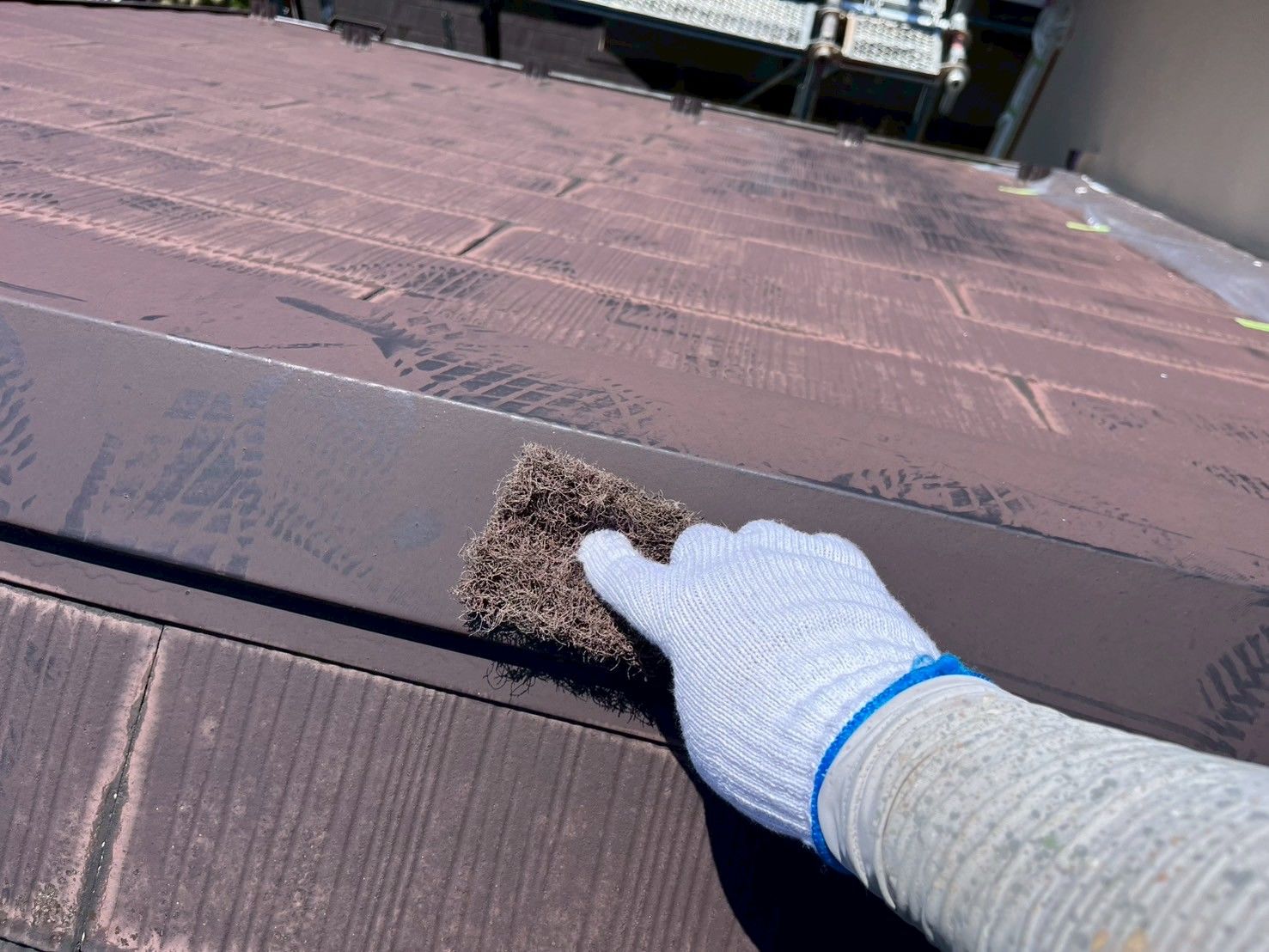 塗膜で屋根材同士が密着しないようタスペーサーを差し込んで隙間を確保します