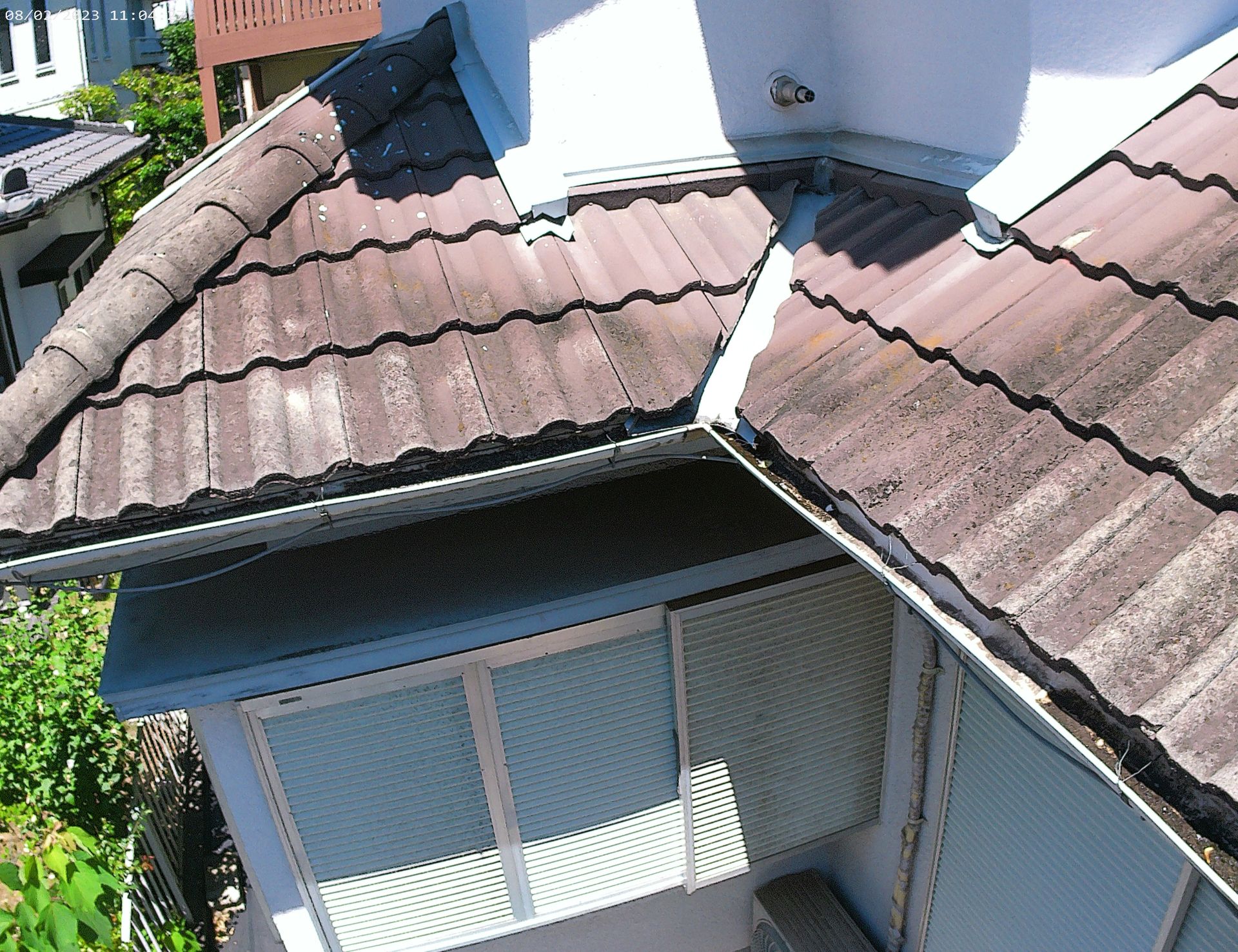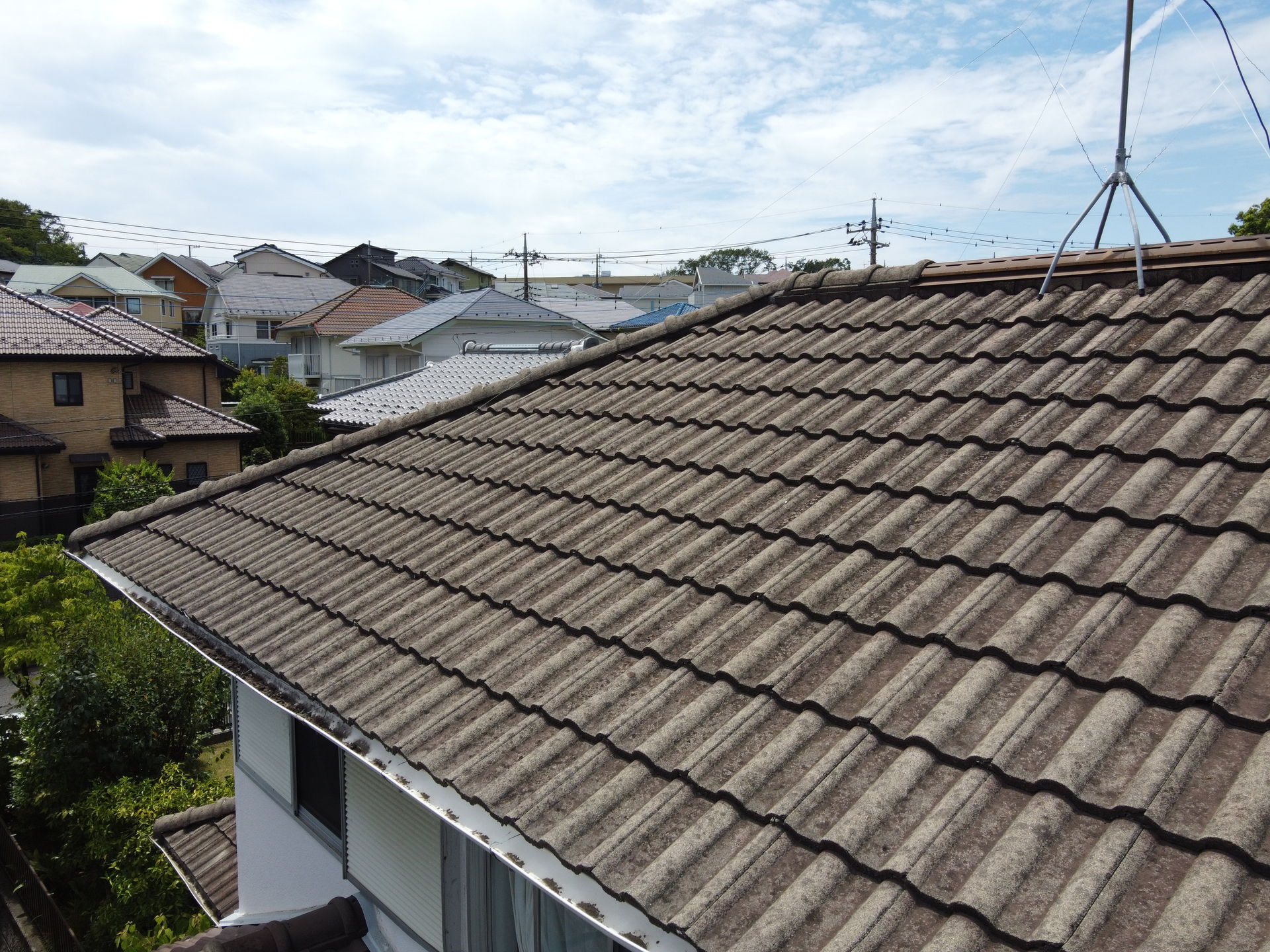 築年数と瓦から風化した漆喰や風に乗って土がたまっている箇所が多く見られ、雨樋から雨水が溢れてしまう【オーバーフロー】現象がおきていました。