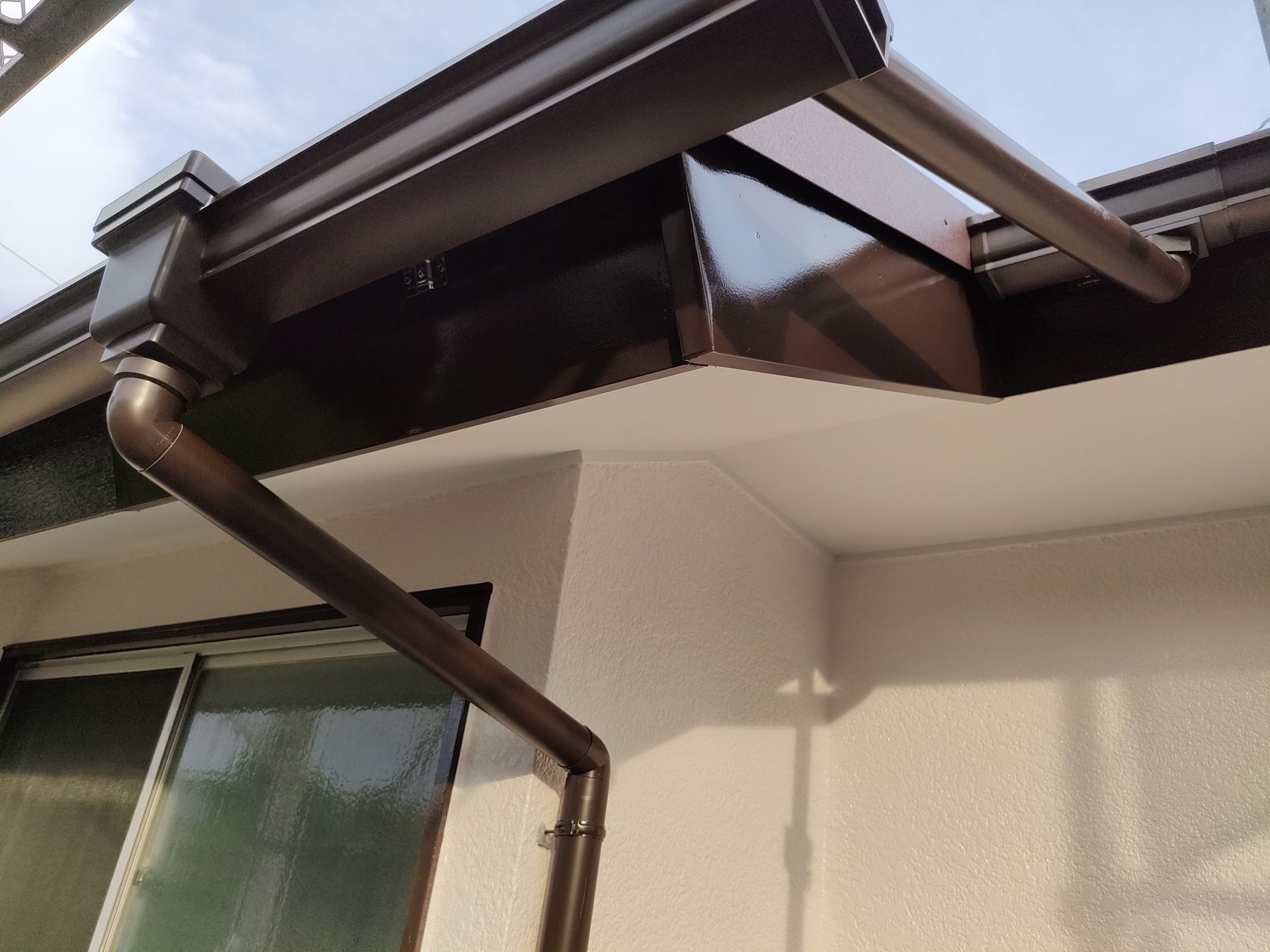 排水量をあげるため丸樋から角樋へ交換となりました。交換後、ゲリラ豪雨がきてもオーバーフローすることなく、雨が外壁に当たったり、滝のように庭に落ちる事もなくなり安心できると喜んでいただけました。