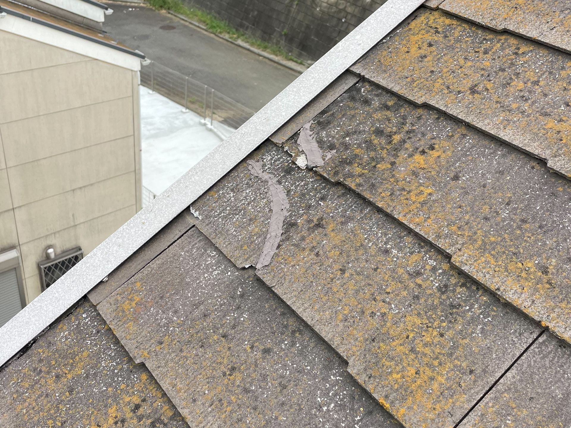 【お問い合わせのきっかけ】スレート屋根の一部が割れてお庭に落ちているのを発見され、比較的近隣であった弊社にお問い合わせ頂きました。