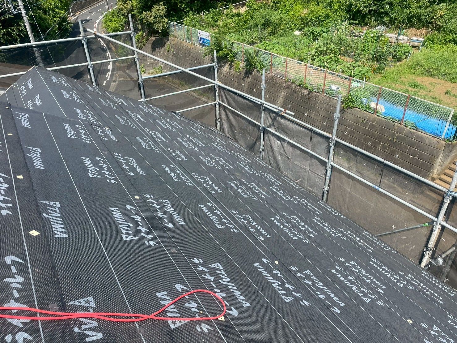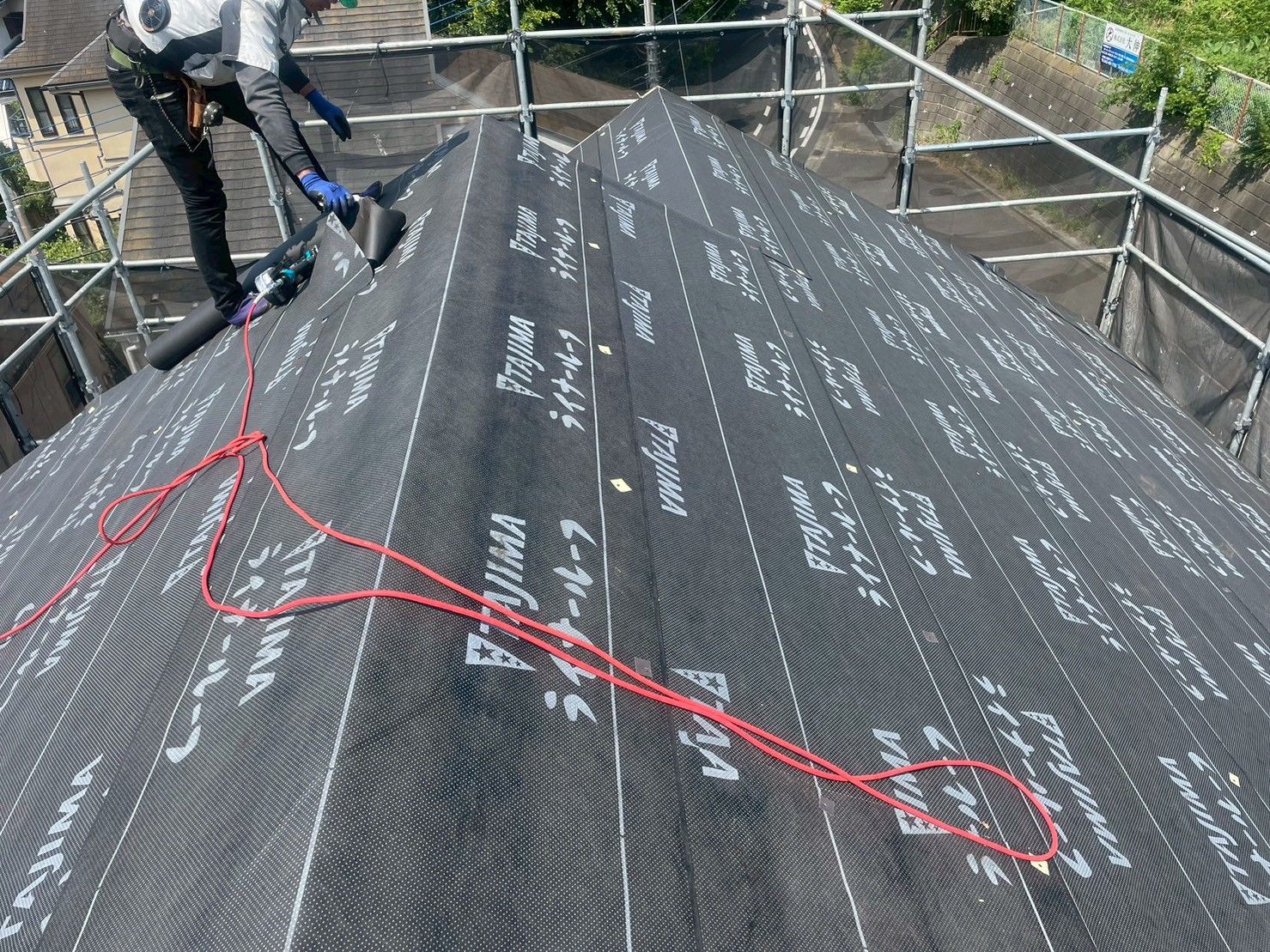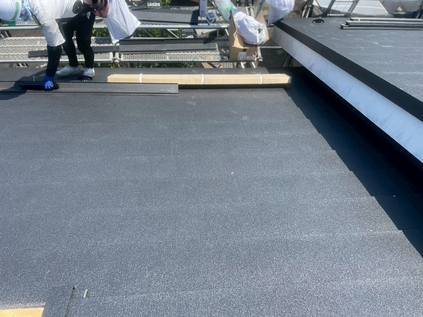 雨水の侵入を防ぐ役割のあるルーフィング(防水シート)を貼っていきます