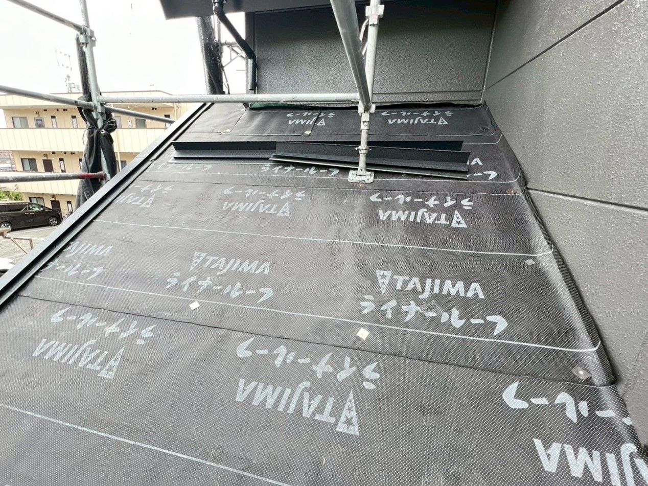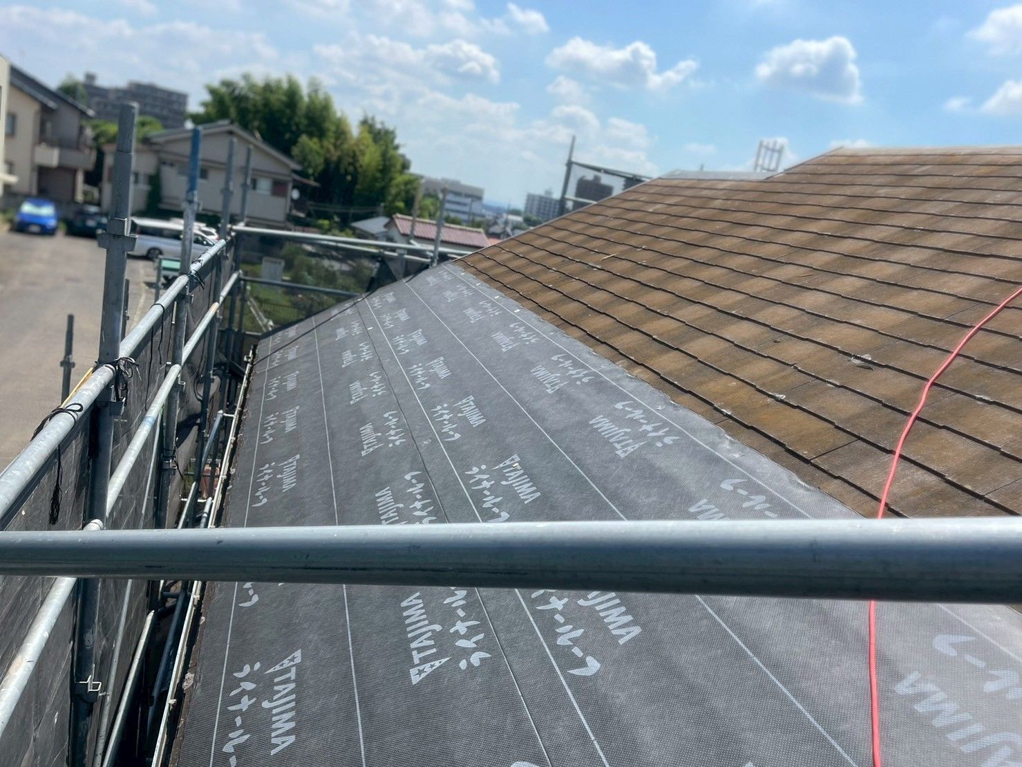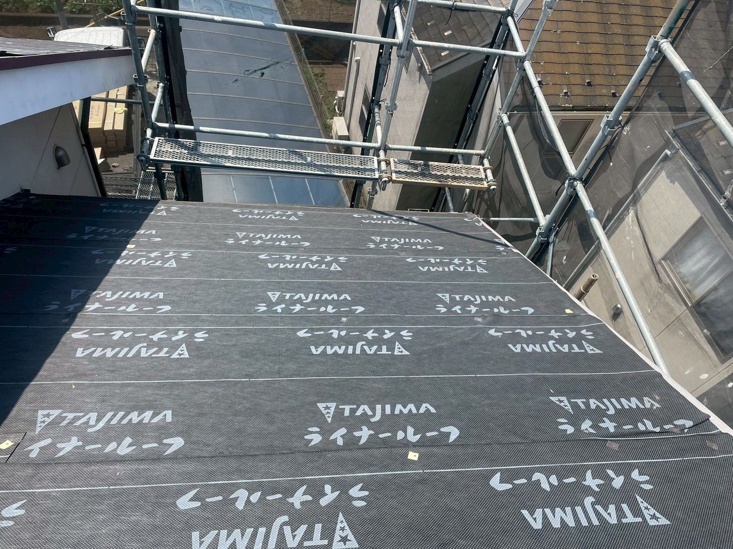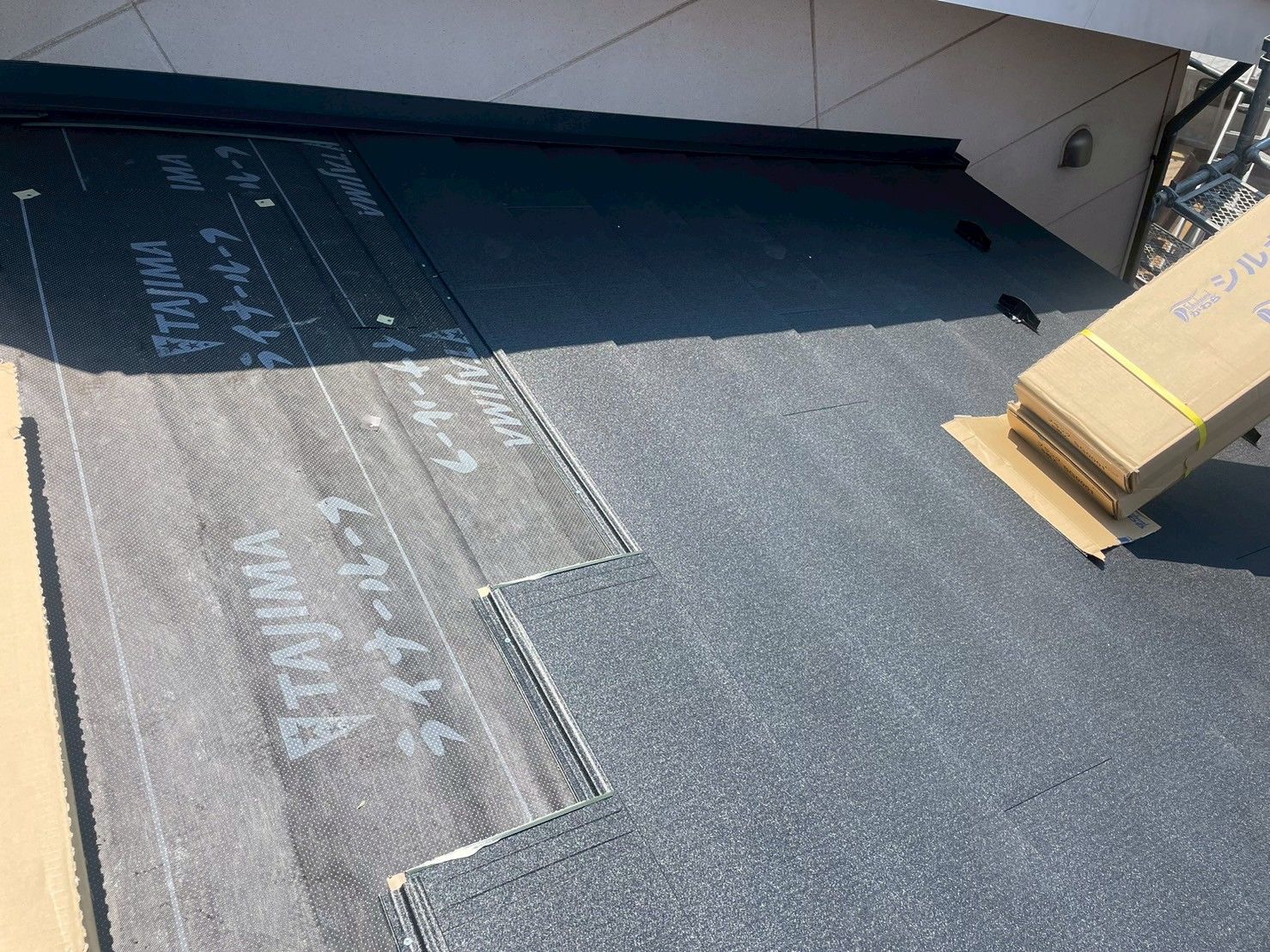 雨水の侵入を防ぐ役割のあるルーフィング(防水シート)を貼っていきます