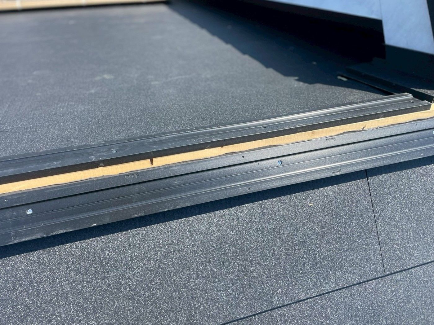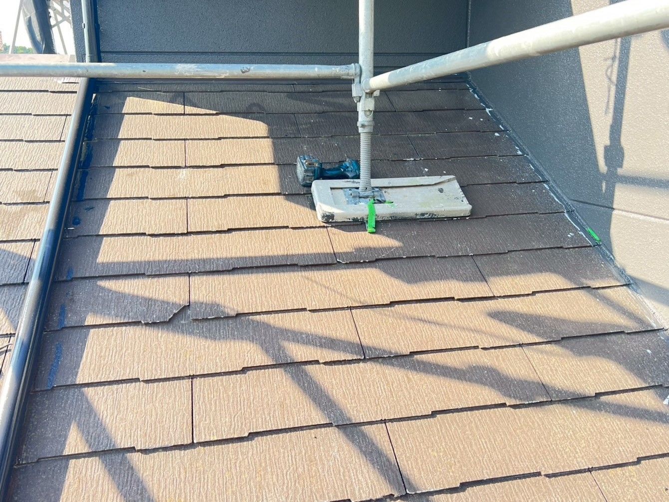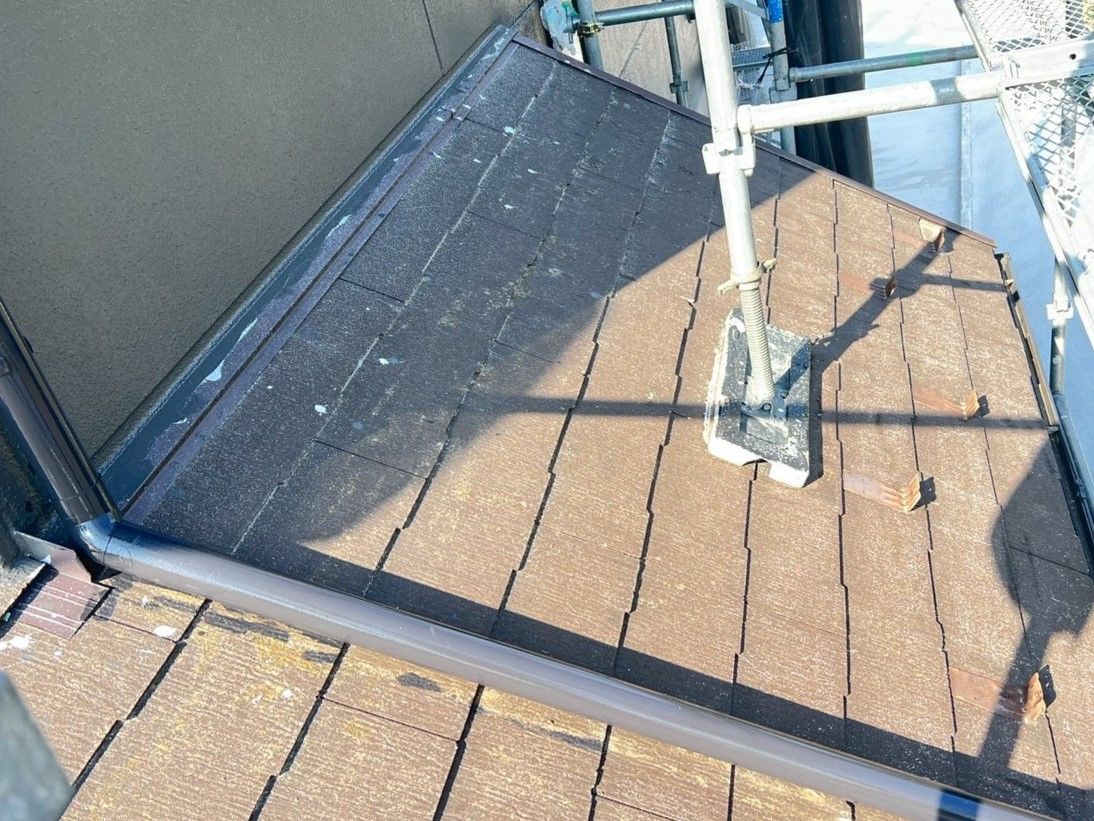 屋根カバー工法では、既存屋根の上から新しい屋根材を重ねるため、使用材料の厚みが加わり、屋根の高さが若干上がります。雨樋との位置関係も変わる為、稀に雨樋の修正が必要となる場合がございます。今回そのパターンに該当しましたので、雨樋の位置を調整する工事を併せて行っております。
