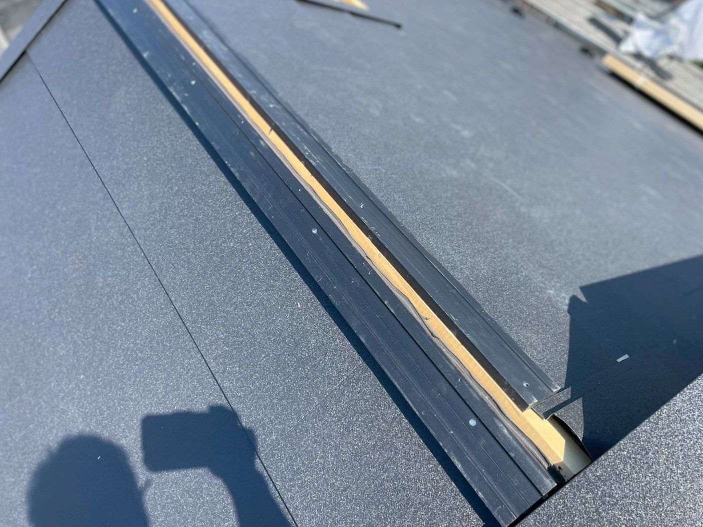 割れた屋根材はそのままの形で保存されていたので、念の為、もとの位置に戻す形で補修いたしました。その後のカバー工事において破損部分によって出来てしまうへこみを解消し、高さ調整の機能を果たします。