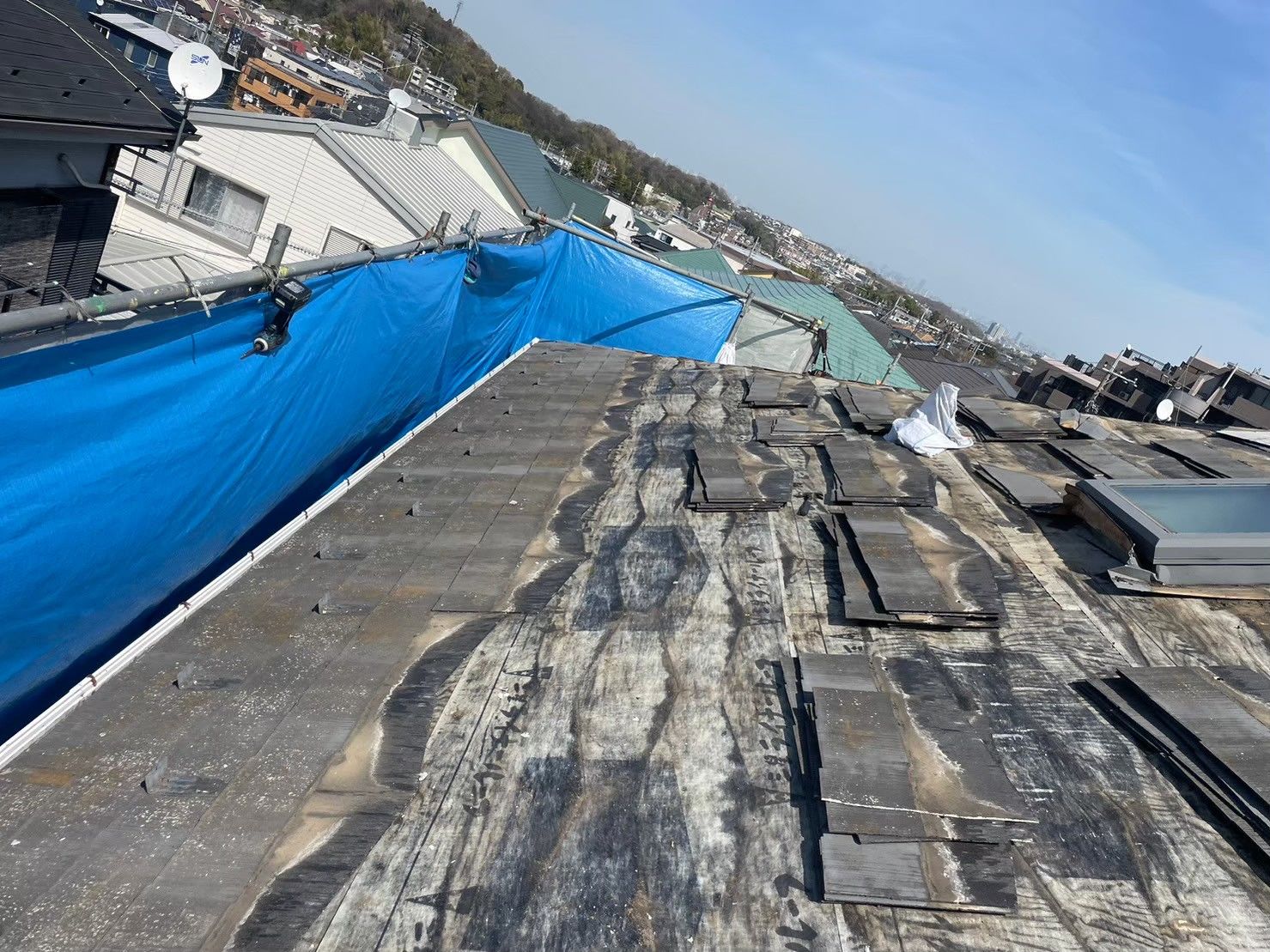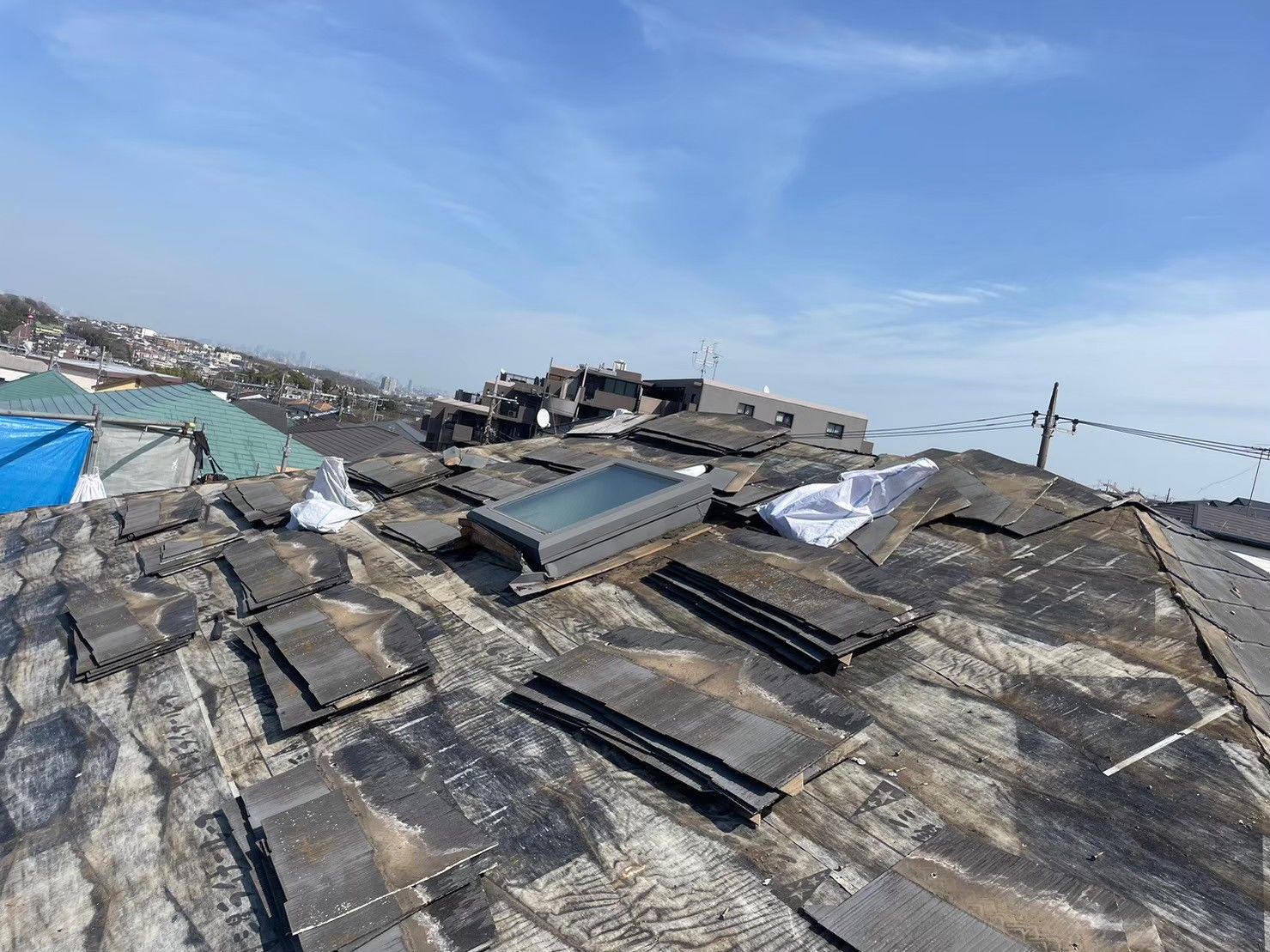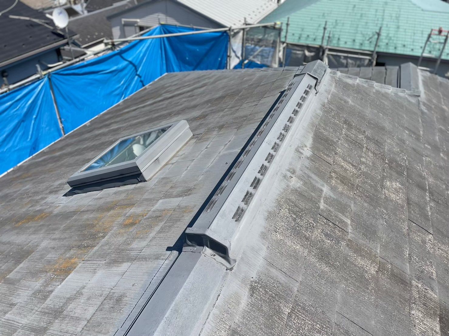 お問い合わせ時はスーパーガルテクトでのカバー工法をご検討でしたが、重ね葺き(屋根カバー工事)を選択された場合に加わってしまう屋根材の重みや金属屋根特有の雨音などが気になられるとの事で、既存屋根と同じスレートでありながらより耐候性の高いコロニアルグラッサでの葺き替えをご提案させて頂きました。